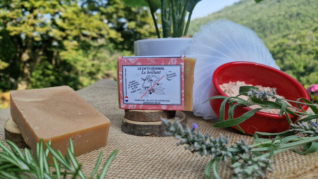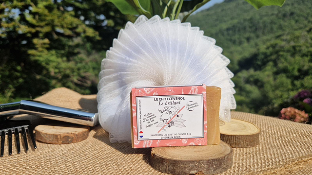 Un shampoing solide artisanal, enrichi en 20% de lait de nos chèvre, spécialement formulé pour les cheveux secs.